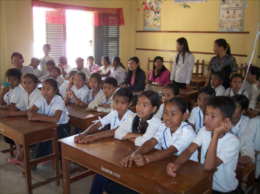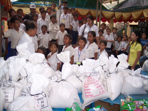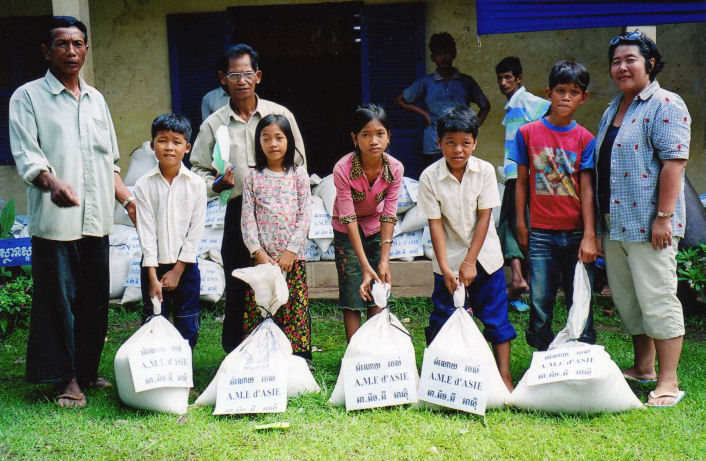 Distribution à chaque écolier, de quoi se vêtir, 15kg de riz, 2 kg de nouilles, 1 litre de sauce de soja, 1 litre de sauce de poisson, 1kg de sucre en poudre, une paire de tongs, des cahiers, des stylos et des crayons de couleur.Chaque jour, les enfants parcourent 2 heures de marche pieds nus à travers les champs pour venir à l’école