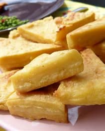 Lorsque la pâte est bien figée, taillez-la en petits disques, en frites ou en cubes.