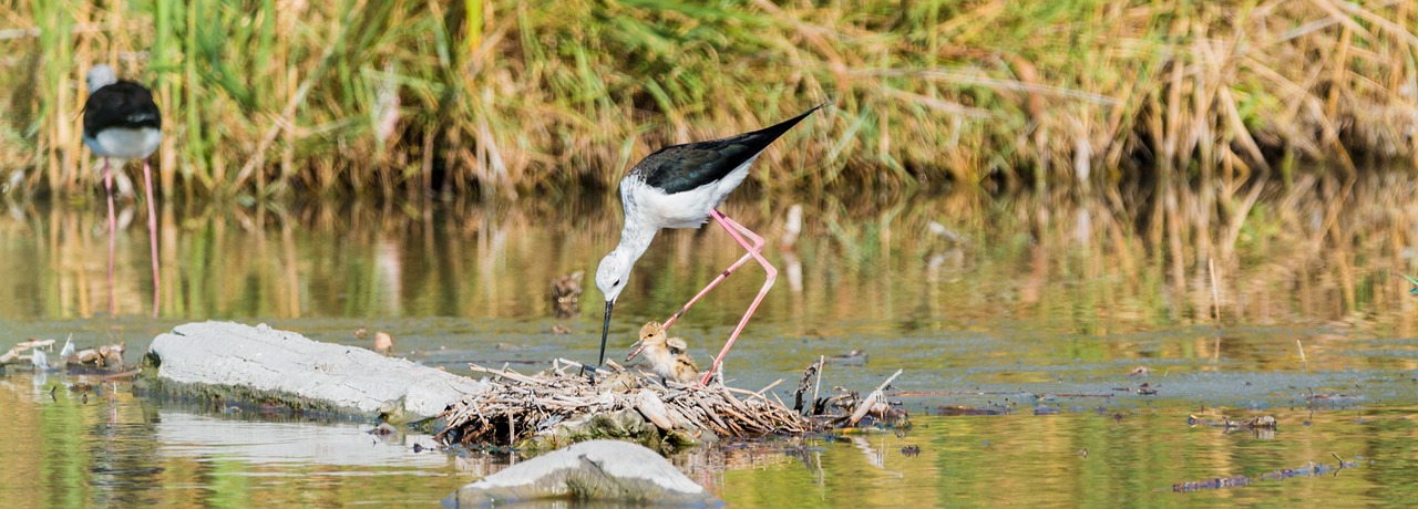 l'échasse à ailes noires et diverses espèces de hérons, d'aigrettes et de